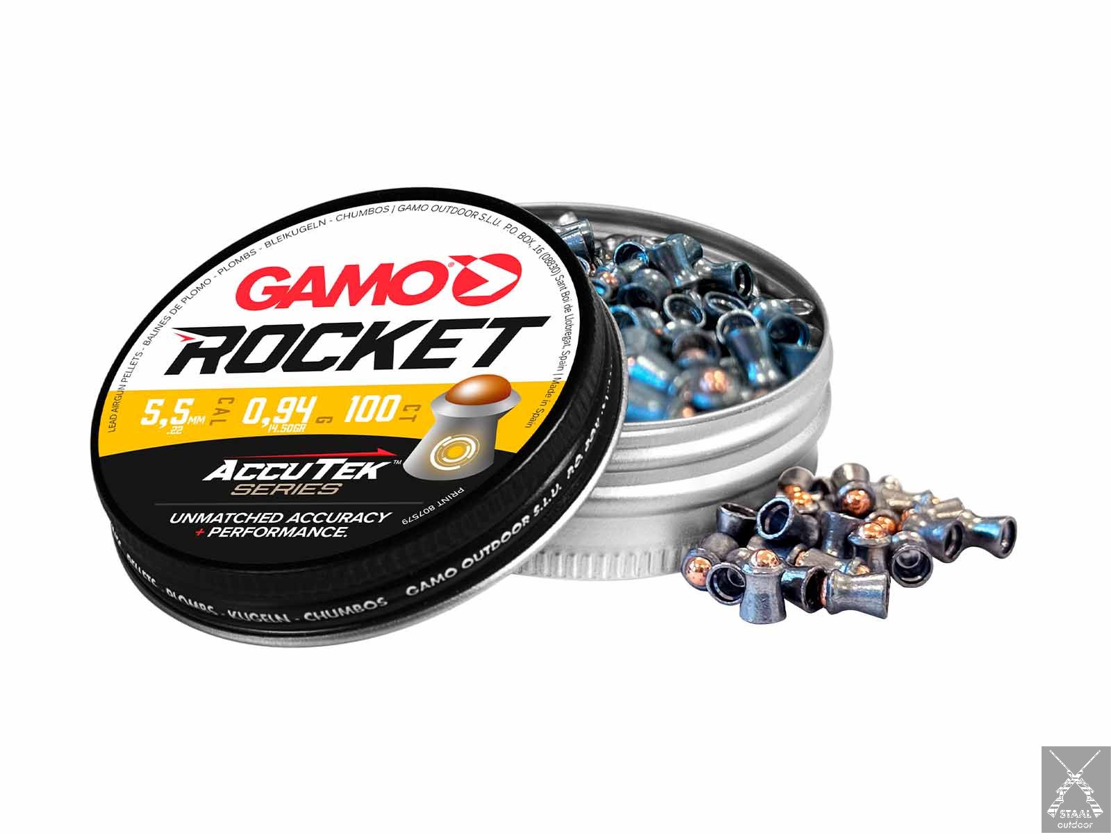 Gamo Rocket ACCUTEK 5,50mm met een verkoperde bol aan de voorkant, waardoor er extra impact ontstaat.
