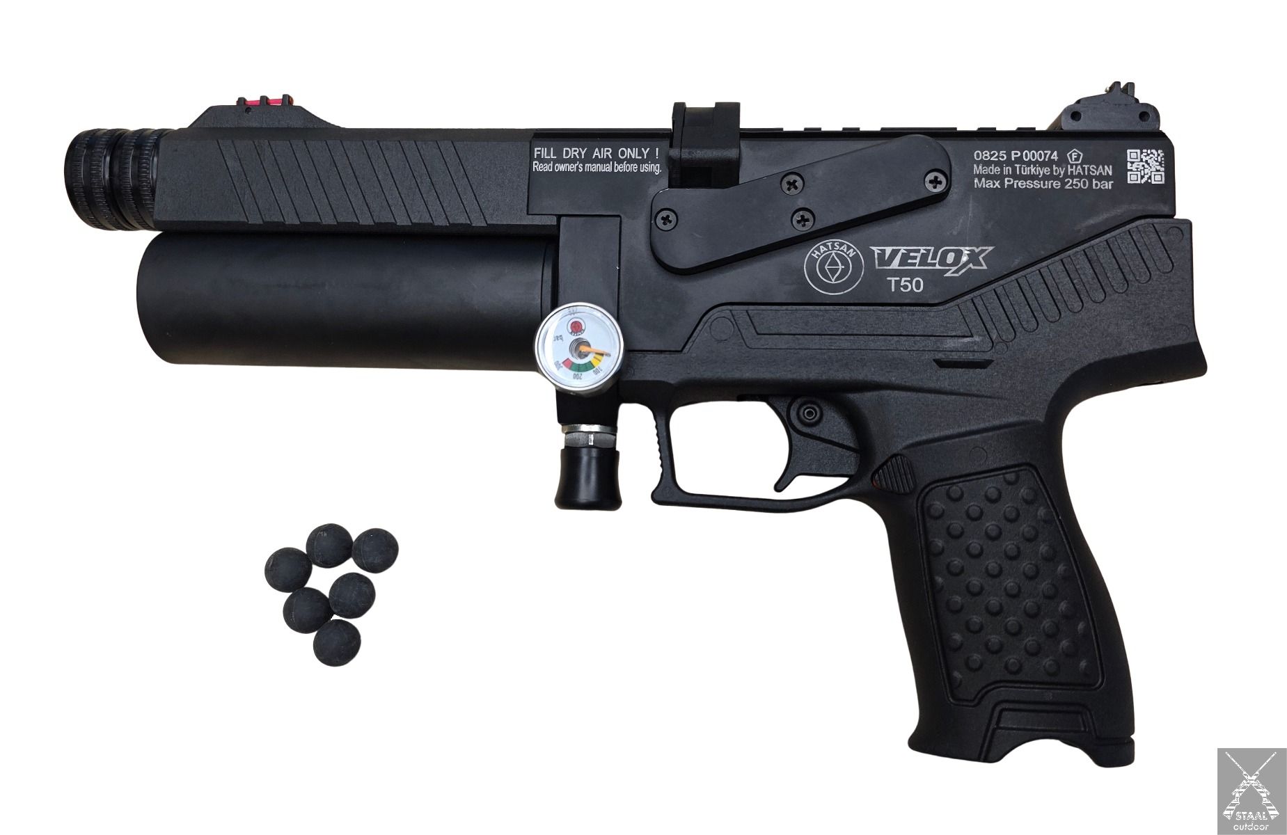 De Hatsan Velox T50 is een semi-automatisch persluchtpistool die kaliber .50 ballen kan schieten met een kracht van 10 Joule en met de barrel extension 15 Joule.