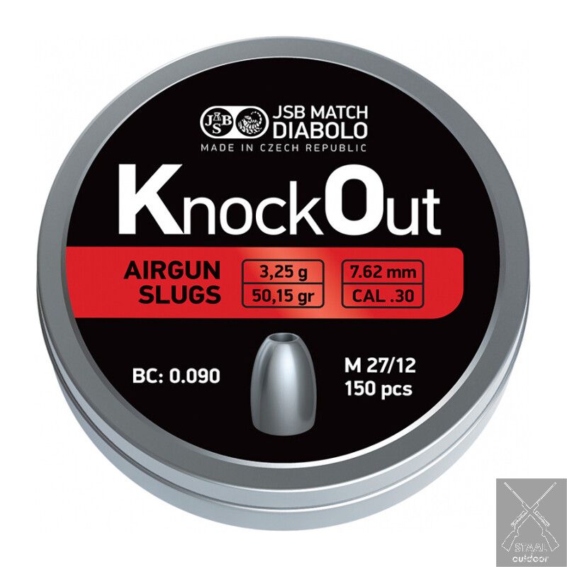 JSB Knock Out Slugs 7.62 mm / .30 zijn, met een gewicht van 50,15 grain, zware slug kogels die, dankzij de holle punt en zacht lood, een goede expansie hebben.