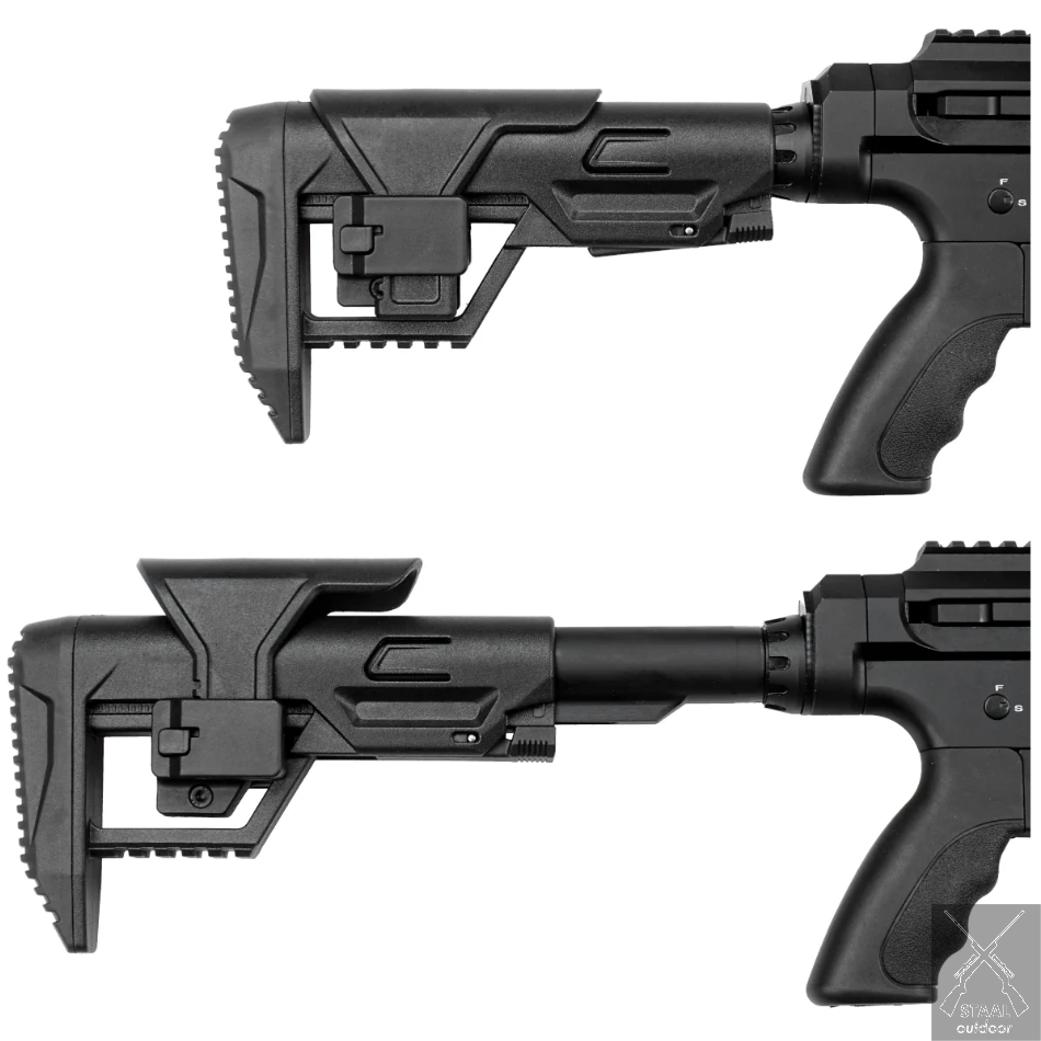 Het ergonomische ontwerp, de verstelbare kolf en de moderne zwarte afwerking maken de Reximex Nyx niet alleen krachtig, maar ook comfortabel en stijlvol.